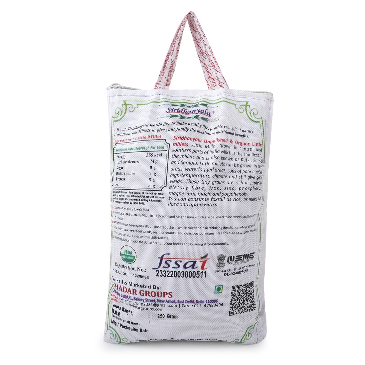 Siridhanya Unpolished and Organic Little Millets 250gm pack, Gross wt 400gm) Organically Grown from Karnataka